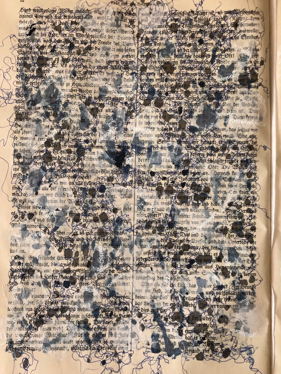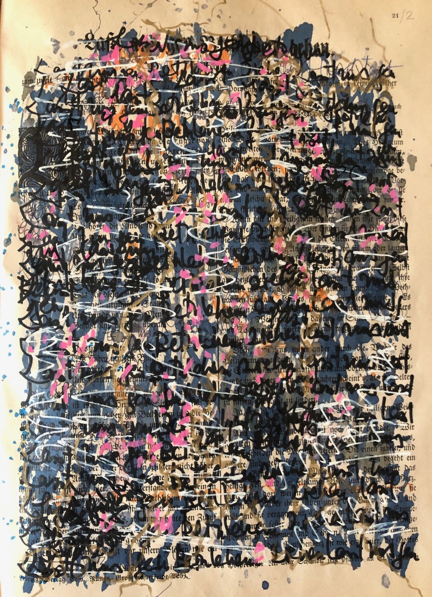 Gesprächsprotokolle (Palimpsest), 2024; 26×35 Tinte/Faserstift/Ölkreide auf 100jährigem Papier